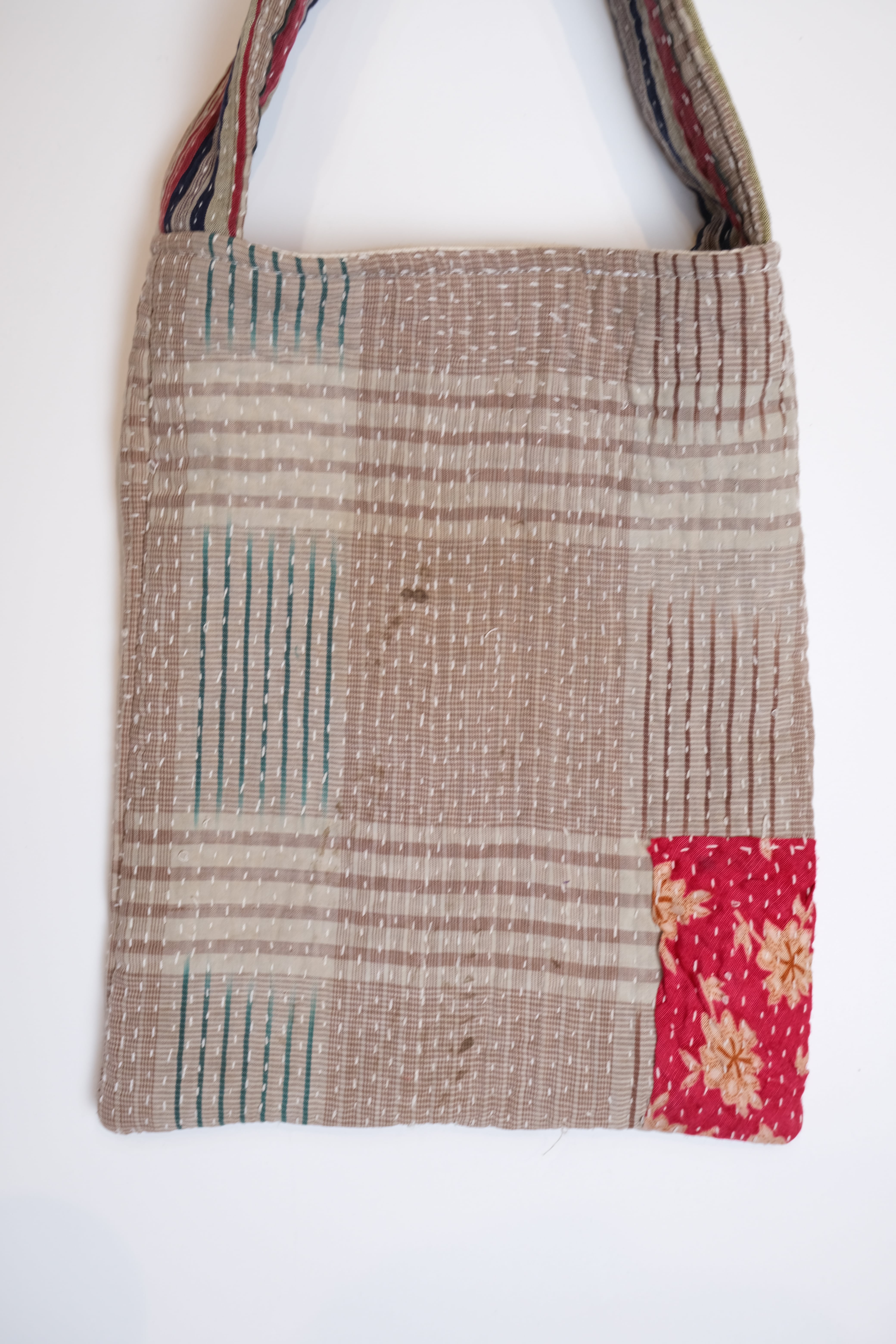 カラフルなパッチワークと、刺し子ならではの温かみのある針目が、素晴らしいバッグです。