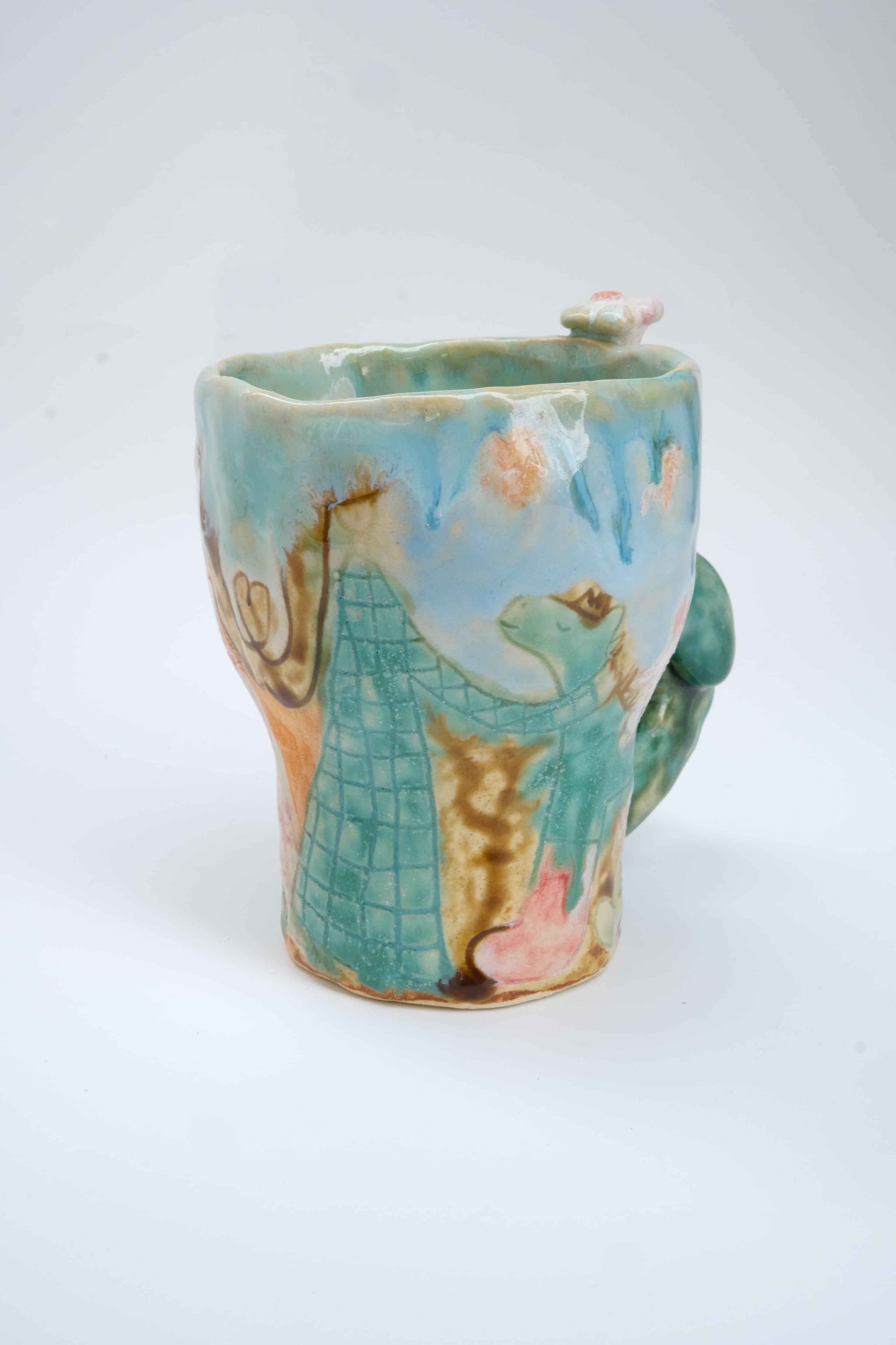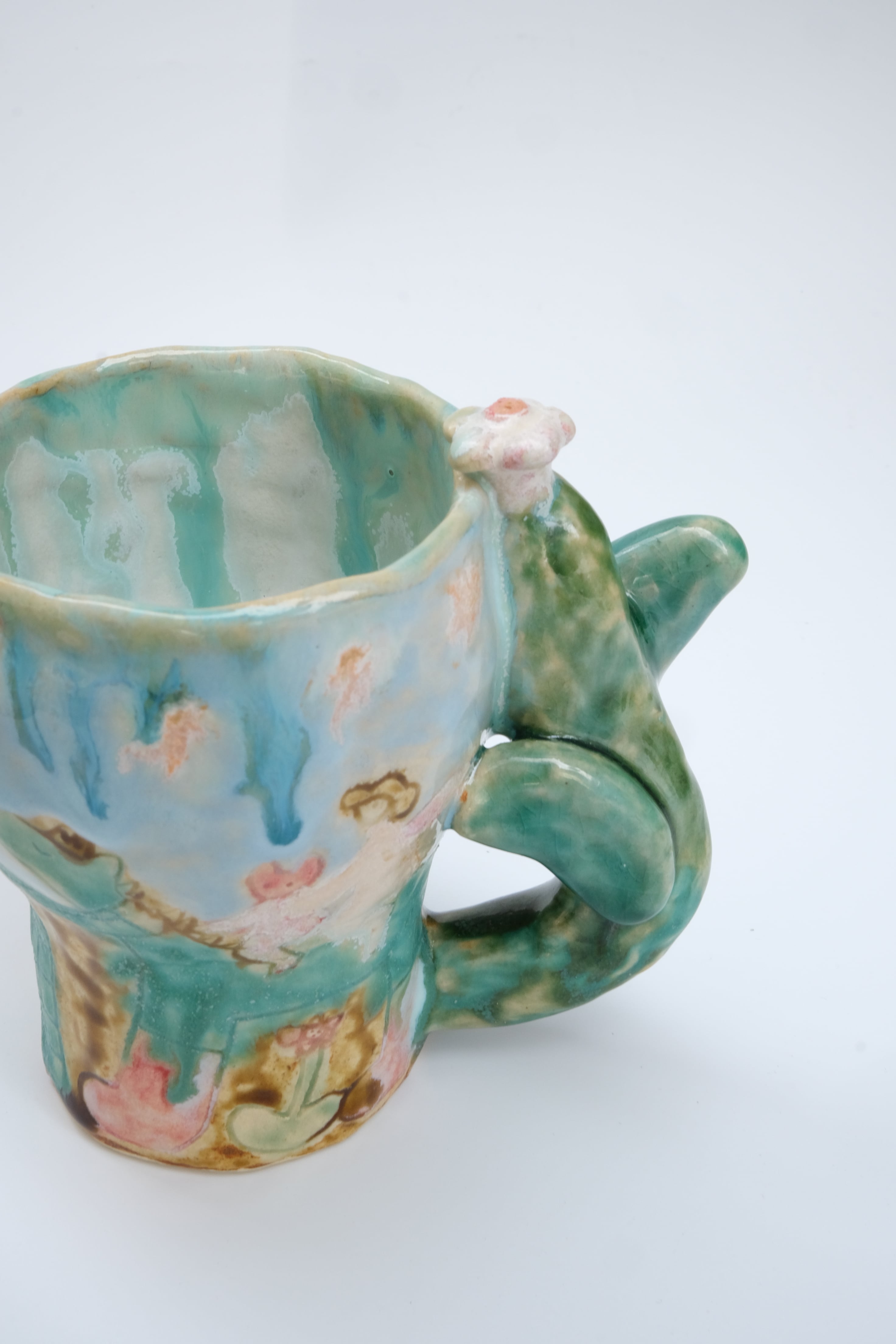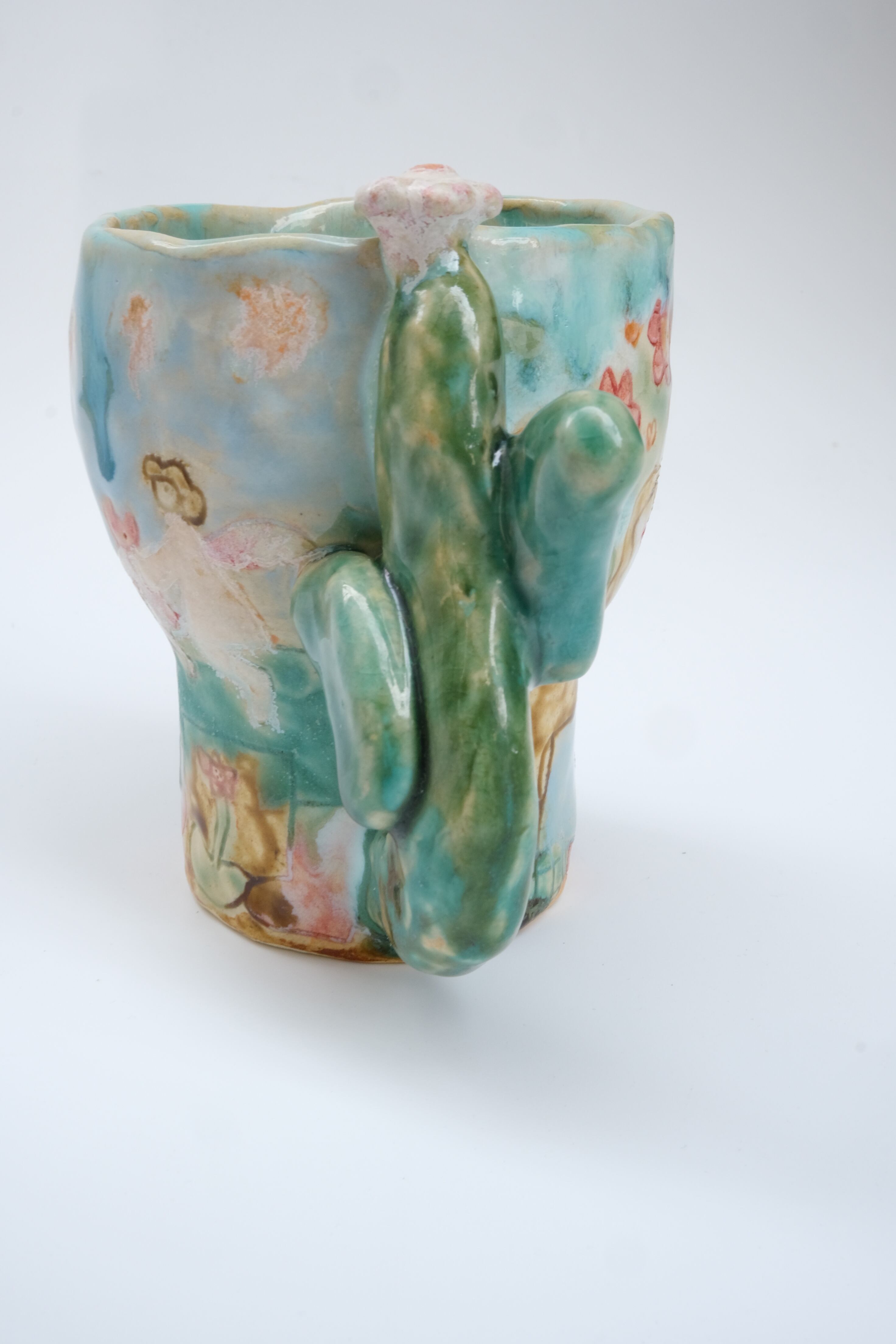 動物や人やお花が描かれ、特徴的な取っ手のコップ。