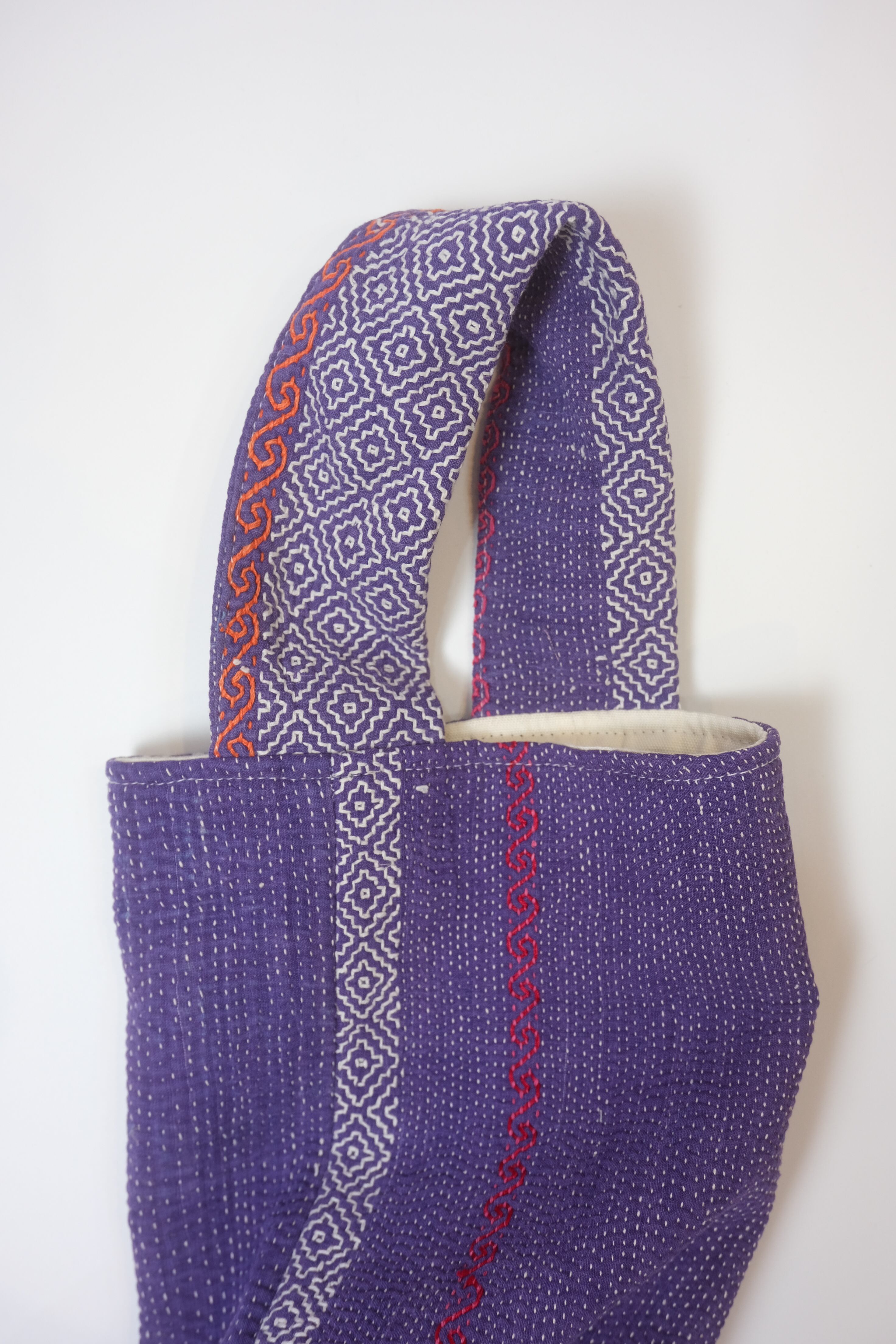 カラフルなパッチワークと、刺し子ならではの温かみのある針目が、素晴らしいバッグです。