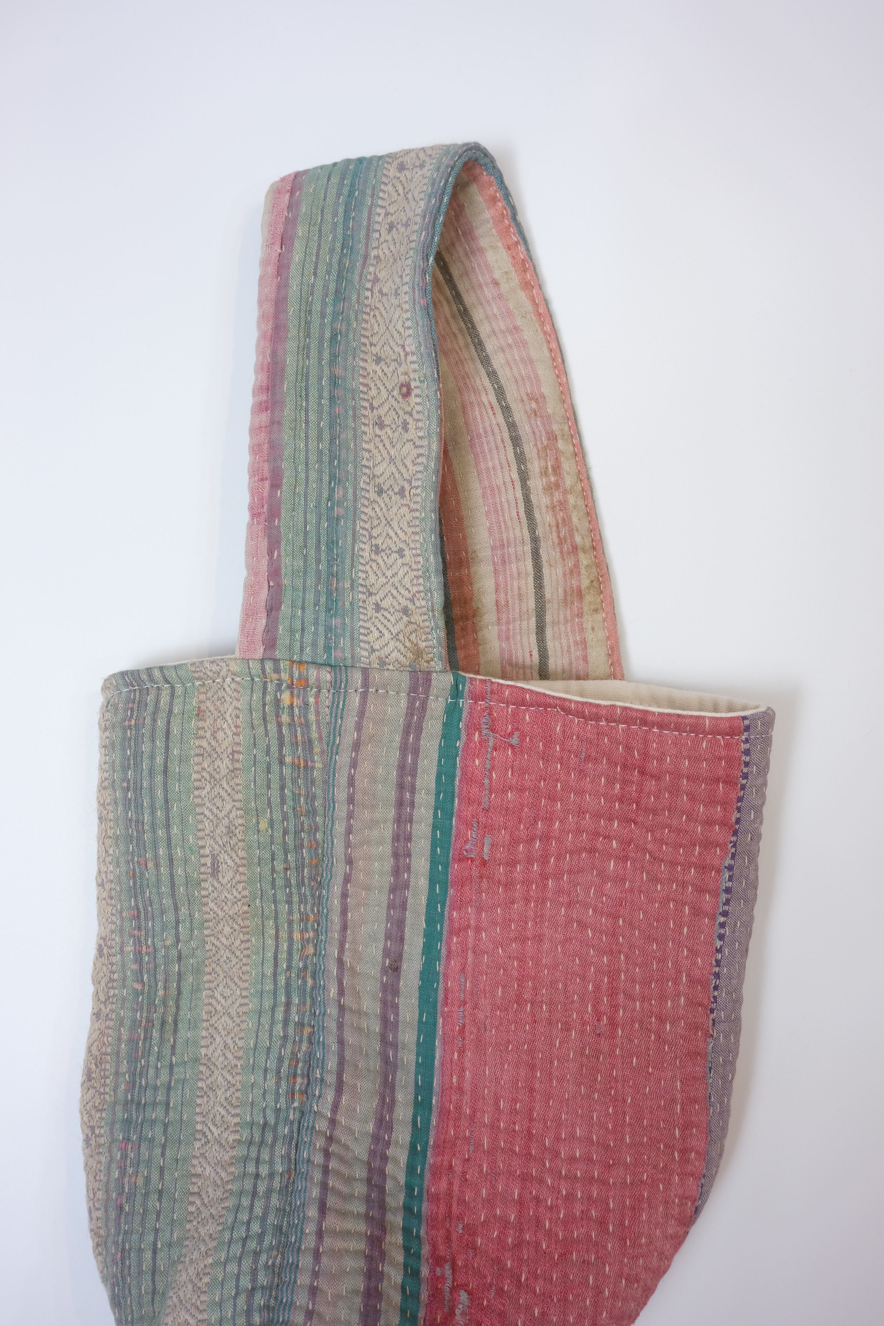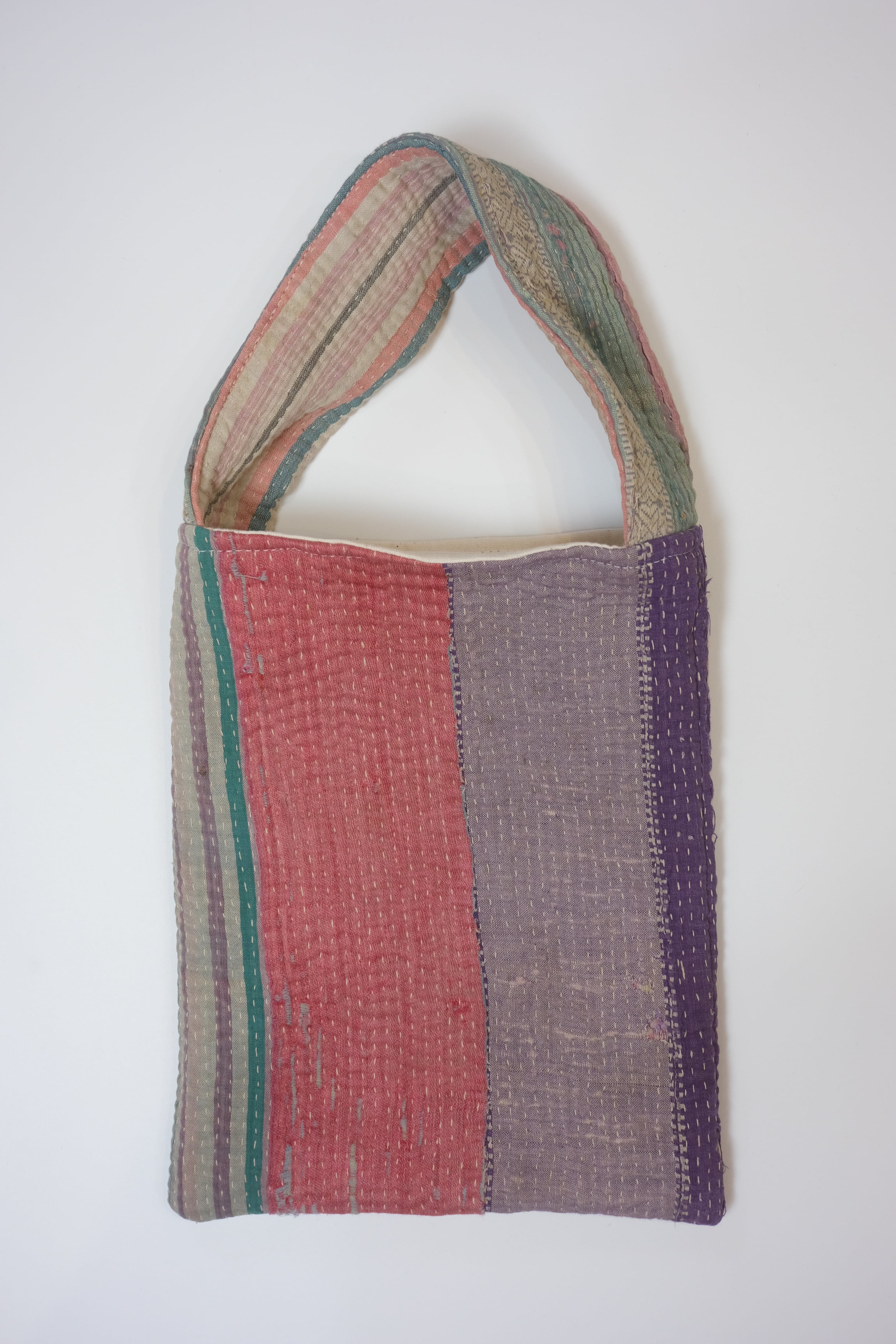 インド・パキスタン・バングラデシュなど、中央アジアで長年受け継がれてきた伝統工芸品のヴィンテージキルトをミニトートバッグ型にしています。