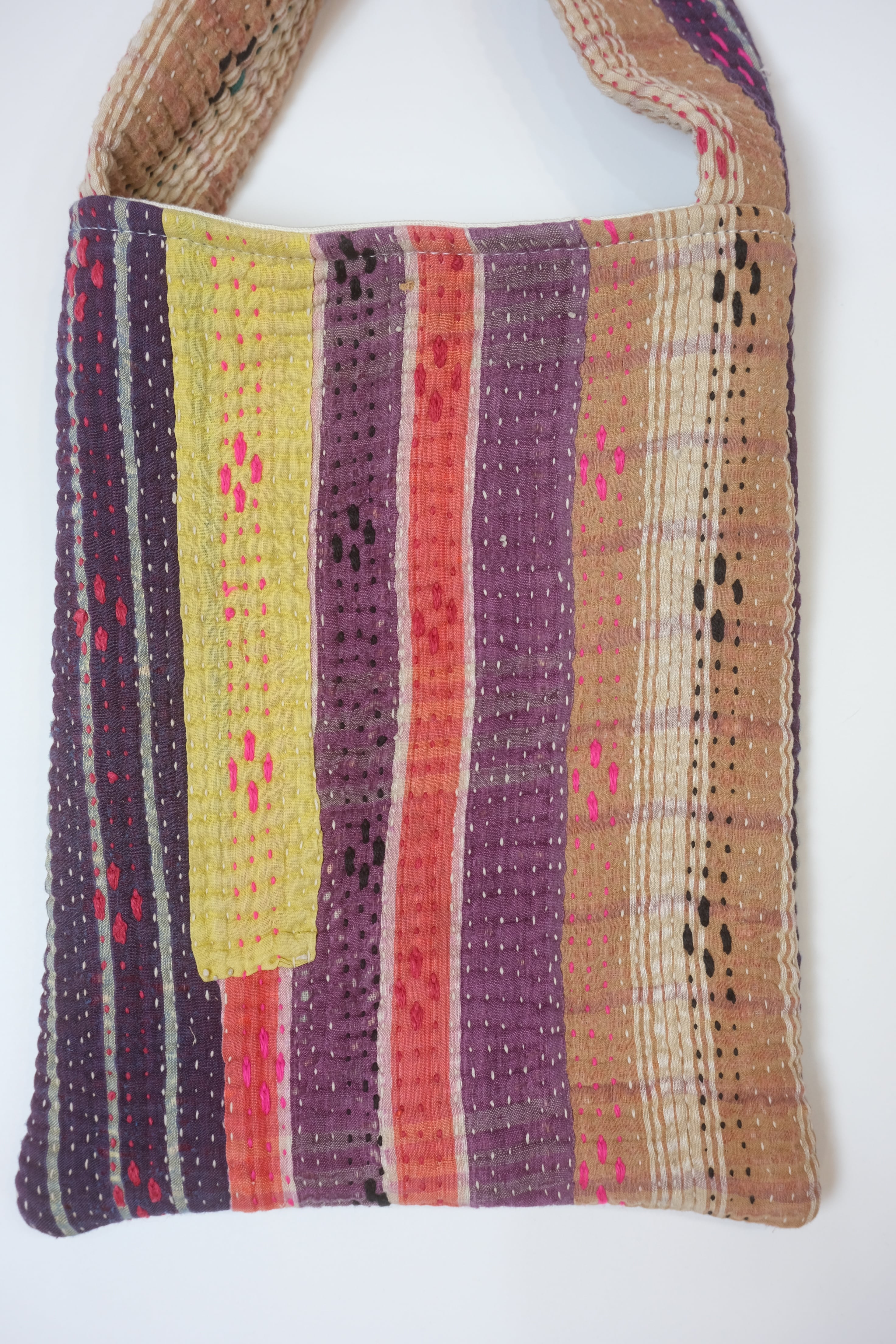 インド・パキスタン・バングラデシュなど、中央アジアで長年受け継がれてきた伝統工芸品のヴィンテージキルトをミニトートバッグ型にしています。